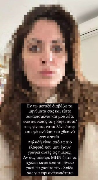 Μία μέρα μετά, η ίδια υπογράμμισε «Όπως καταλαβαίνετε, αυτή την εβδομάδα, έχω ακούσει πάλι τα σχολιανά μου για αυτό το βίντεο που είπα τέσσερις λέξεις. Δημιούργησα όλη αυτή την αναστάτωση. Για το παιδί μου έχω ακούσει, για τον έτσι μου… αλλά για το επόμενο μήνυμα που έλαβα, τραβάω κόκκινη γραμμή» και πρόσθεσε «Εν τω μεταξύ διαβάζω τα μηνύματά σας και είστε σοκαρισμένοι και μου λέτε «πω πω ποιος τα γράφει αυτά/πως γίνεται να τα λένε έτσι;». Ανέβασα το χθεσινό σαν αστείο. Δηλαδή είναι από τα πιο ελαφριά που μου έχουν γράψει αυτές τις ημέρες. Αν σας σόκαρε μη δείτε τα σχόλια κάτω από το βίντεο γιατί θα χάσετε την ελπίδα σας για την ανθρωπότητα».