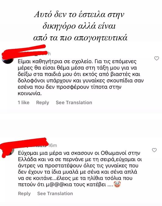 Ακολούθησε νέα της ανάρτησή, στην οποία επισημαίνει ότι πρόκειται να κινηθεί νομικά και έχει ήδη στείλει στον δικηγόρο της ορισμένα από τα αισχρά σχόλια που έλαβε, συμπληρώνοντας ότι οι αποστολείς αυτών των μηνυμάτων εμφανίζονται κανονικά με τα ονοματεπώνυμά τους.