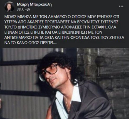 «Μόλις μίλησα με τον δήμαρχο, ο οποίος μου εξήγησε ότι ύστερα από άκαρπες προσπάθειες να βρουν τους συγγενείς του, το δημοτικό συμβούλιο αποφάσισε την εκταφή. Όλα έγιναν όπως έπρεπε και θα επικοινωνήσω με τον αντιδήμαρχο για τα οστά και τη φροντίδα τους που ζήτησα να το κάνω όπως πρέπει» έγραψε η Μαίρη Μπάρκουλη.