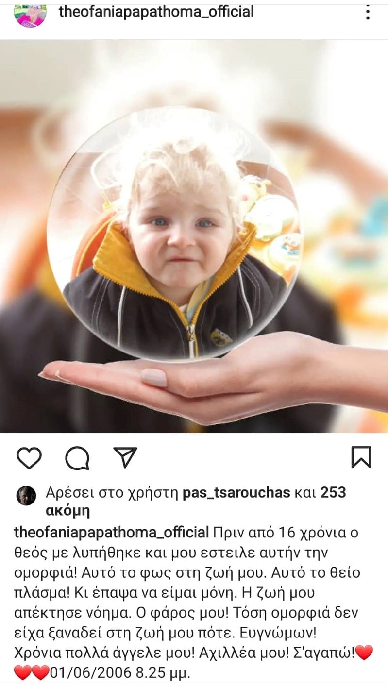 «Πριν από 16 χρόνια ο θεός με λυπήθηκε και μου έστειλε αυτήν την ομορφιά! Αυτό το φως στη ζωή μου. Αυτό το θείο πλάσμα! Κι έπαψα να είμαι μόνη. Η ζωή μου απέκτησε νόημα. Ο φάρος μου! Τόση ομορφιά δεν είχα ξαναδεί στη ζωή μου ποτέ. Ευγνώμων! Χρόνια πολλά άγγελε μου! Αχιλλέα μου! Σ’ αγαπώ!❤️❤️❤️01/06/2006 8.25 μμ.