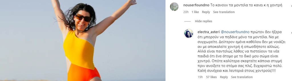 «Το κάνουν τα μοντέλα το κάνει κ η χοντρή», της έγραψαν.