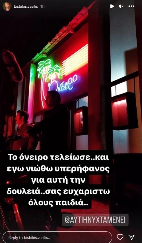Ο Βασίλης Μπισμπίκης ολοκλήρωσε πρόσφατα τα γυρίσματα της αγαπημένης σειράς του Alpha “Αυτή η νύχτα μένει”. Ο γνωστός ηθοποιός μοιράστηκε τα νέα μέσω του προσωπικού του λογαριασμού στο Instagram, ανακοινώνοντας το τέλος ενός ονείρου και εκφράζοντας την περηφάνια του για το αποτέλεσμα.