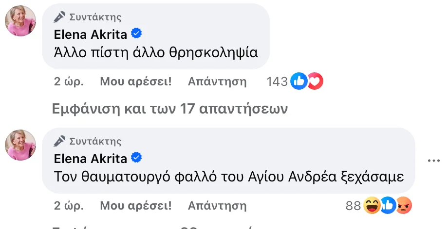 «Σας παρακολουθώ και σας θαυμάζω. Ίσως είναι η πρώτη φορά που διαφωνώ μαζί σας. Στο πρόσωπο της Παναγίας κάποιοι βλέπουν το πρόσωπο της ΜΑΝΑΣ Πως θα σας φαινόταν να βλέπατε τη μάνα σας σε αυτή την εικόνα Η ΑΛΛΗ ΑΠΟΨΗ !!!!», αναφέρει ένα σχόλιο κάτω από την ανάρτηση.