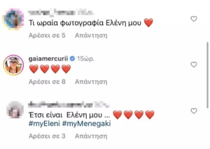 Ανάμεσα στα σχόλια κάτω από την ανάρτησή της, ξεχώρισε εκείνο ενώ της συντρόφου του γιου της, Γαίας Μερκούρη, η οποία εξέφρασε την αγάπη της, σχολιάζοντας κόκκινες καρδιές κάτω από τη φωτογραφία της Ελένης Μενεγάκη…