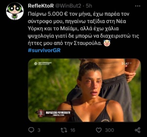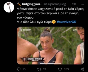 Αν και κανονικά την προσοχή στο χθεσινό αγώνισμα έπρεπε να τραβήξουν οι μονομαχίες των Survivors, μιας και θεωρητικά έχουν μείνει οι καλύτεροι παίκτες, το κοινό στάθηκε στην ανεξήγητα κακή ψυχολογία της Μαριαλένας Ρουμελιώτη. Η παίκτρια των Κόκκινων στο μεγαλύτερο μέρος του παιχνιδιού εξέφραζε πόσο άσχημα νιώθει ψυχολογικά, πόσο «πεσμένη» αισθάνεται μετά τη Νέα Υόρκη και πως σκέφτεται ακόμα και να αποχωρήσει αν δε συνέλθει.