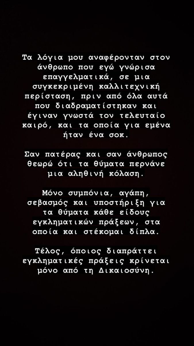 «Τα λόγια μου αναφέρονταν στον άνθρωπο που εγώ γνώρισα επαγγελματικά, σε μία συγκεκριμένα καλλιτεχνική περίσταση, πριν από όλα αυτά που διαδραματίστηκαν και έγιναν γνωστά τον τελευταίο καιρό, και τα οποία για εμένα ήταν ένα σοκ. Σαν πατέρας και σαν άνθρωπος θεωρώ ότι τα θύματα περνάνε μία αληθινή κόλαση. Μόνο συμπόνια, αγάπη, σεβασμός και υποστήριξη για τα θύματα κάθε είδους εγκληματικών πράξεων, στα οποία και στέκομαι δίπλα. Τέλος, όποιος πράττει εγκληματικές πράξεις κρίνεται μόνο από τη Δικαιοσύνη», έγραψε χαρακτηριστικά στο Instagram.