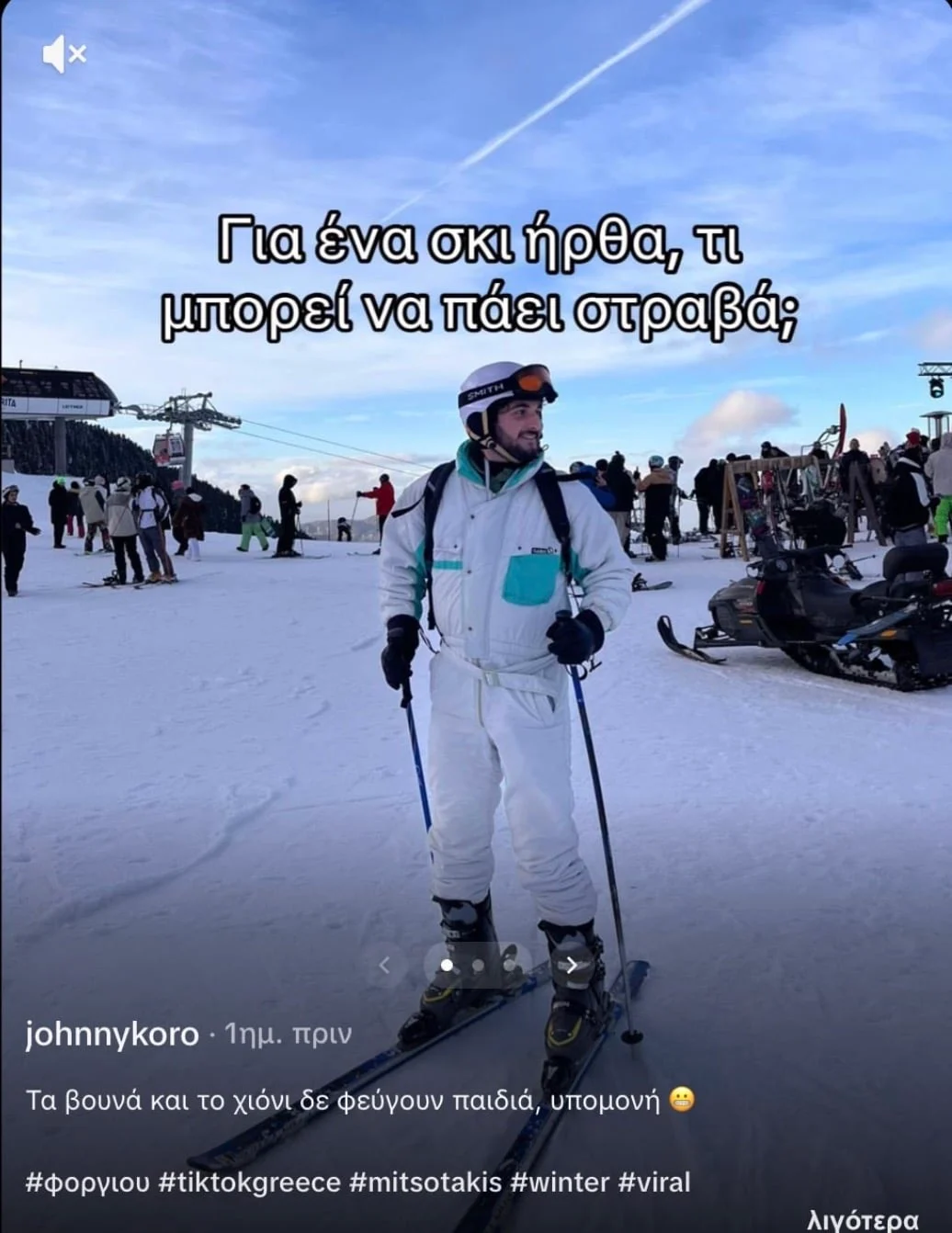 Ένας νεαρός σκιέρ, με όνομα χρήστη στο TikTok johnnykoro, ανέβασε δύο φωτογραφίες από την εξόρμησή του στο βουνό, συνοδευόμενες από ένα screenshot μηνύματος του πατέρα του, που τον προειδοποιούσε να προσέχει επειδή «έχει έρθει για σκι στα Καλάβρυτα ο Μητσοτάκης».