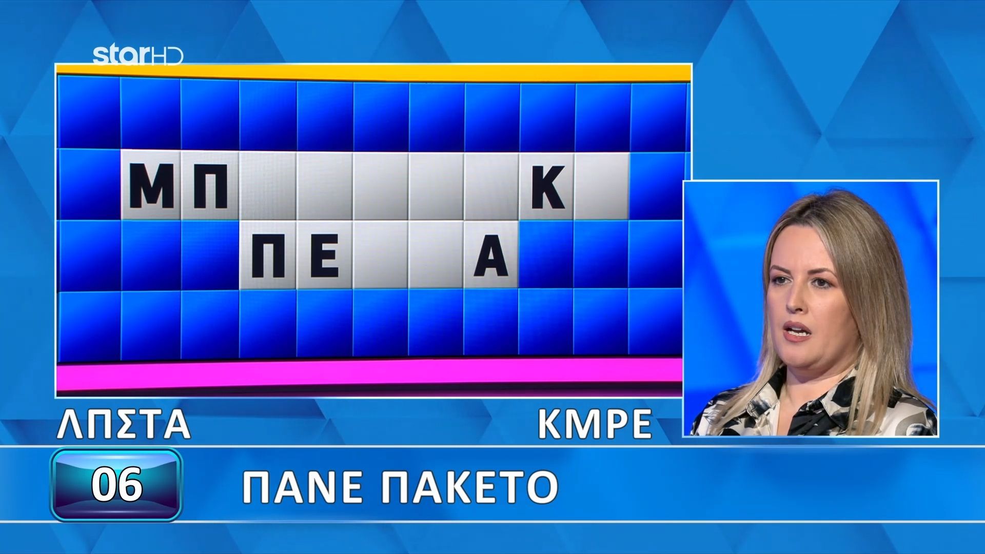 Η κατηγορία ήταν «Πάνε πακέτο», οι επιλογές δεν βοήθησαν είναι η αλήθεια και έτσι δεν βρέθηκε η λύση. Καμία από τις δύο λέξεις δεν βρήκε η παίκτρια. Ο φάκελος έκρυβε 2.000 ευρώ.