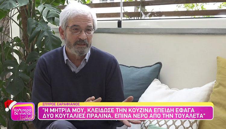 Πιο συγκεκριμένα, ο Σπύρος Σαραφιανός εξομολογήθηκε πως «δεν θεωρώ τον εαυτό μου τυχερό. Η ζωή μου ήταν περίεργη, θα έλεγα, ξεκίνησε πάρα πολύ καλά και γρήγορα χάλασε. Μόλις τελείωσα την πρώτη δημοτικού, οι γονείς μου χώρισαν και στη δευτέρα δημοτικού μπαίνουμε μαζί με τον μεγαλύτερο αδελφό μου οικότροφοι στο σχολείο για έναν χρόνο».