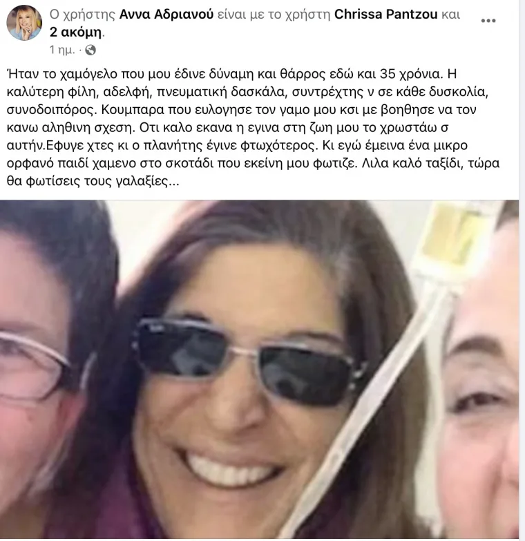 «Ήταν το χαμόγελο που μου έδινε δύναμη και θάρρος εδώ και 35 χρόνια. Η καλύτερη φίλη, αδελφή, πνευματική δασκάλα, συντρέχτης σε κάθε δυσκολία, συνοδοιπόρος. Κουμπάρα που ευλογησε τον γαμο μου και με βοηθησε να τον κανω αληθινή σχέση. Ό, τι καλό έκανα η έγινα στη ζωή μου το χρωστάω σ’ αυτήν. Έφυγε χτες κι ο πλανήτης έγινε φτωχότερος. Κι εγώ έμεινα ένα μικρό ορφανό παιδί χαμένο στο σκοτάδι που εκείνη μου φώτιζε. Λίλα καλό ταξίδι, τώρα θα φωτίσεις τους γαλαξίες…», έγραψε χαρακτηριστικά στη λεζάντα της η Άννα Αδριανού.