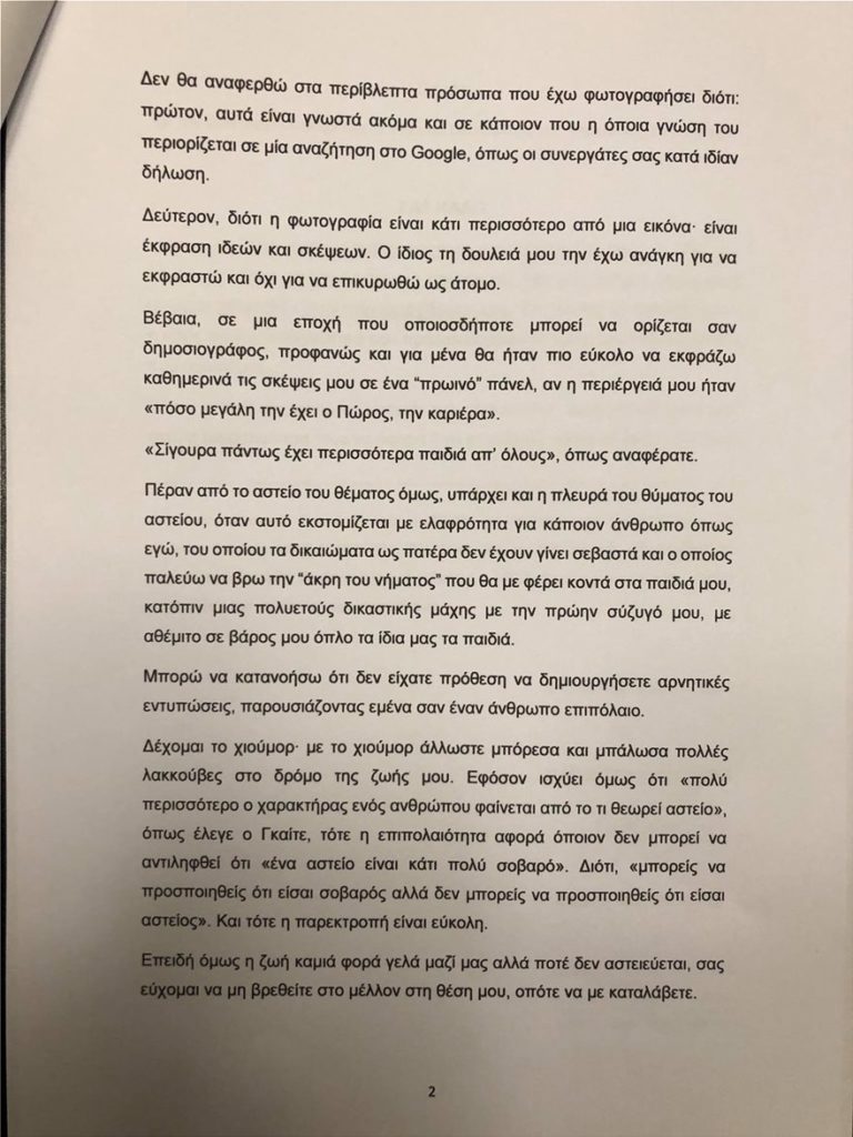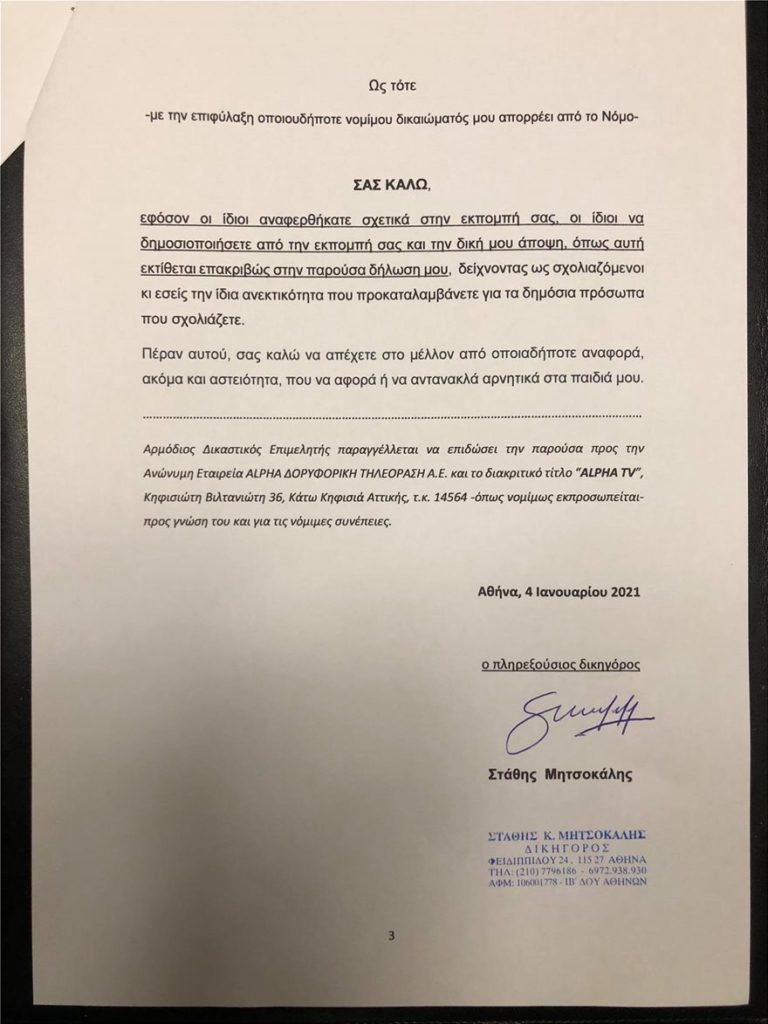 Στο τέλος της εξώδικης δήλωσης ο γνωστός φωτογράφος καλεί του συντελεστές της εκπομπής τους Alpha να δημοσιοποιήσουν ως απάντηση του τα όσα αναφέρονται στην παρούσα δήλωση του ενώ τους καλεί στο μέλλον να απέχουν από οποιαδήποτε σχόλιο ή αστειότητα που μπορεί να αντανακλά αρνητικά στα παιδιά του.