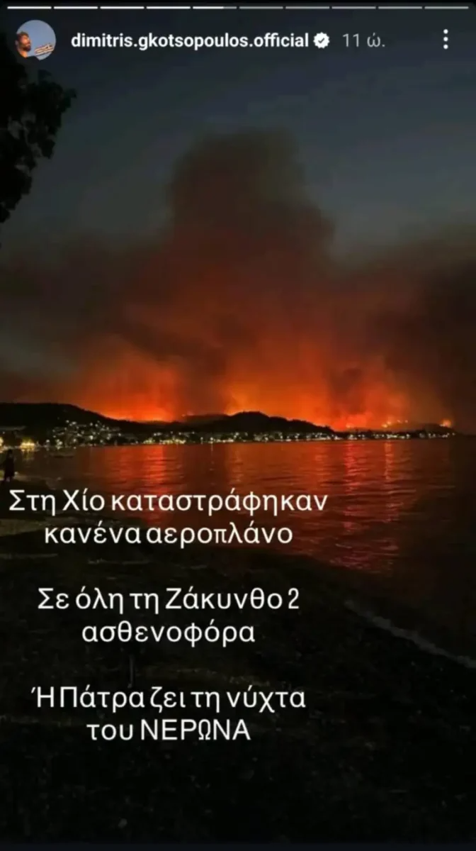 «Επειδή μου στέλνετε πολλά μηνύματα είμαι καλά. Περάσαμε το απόγευμα σχεδόν μέσα από τις φλόγες για να προλάβουμε το χωριό. Σχεδόν καήκαν οι άνθρωποι, κατέφυγαν στη θάλασσα, χάθηκαν σπίτια, περιουσίες, ένας παράδεισος πάει και η Βόρεια Χίος. Η απόλυτη ανοργανωσία. Ό,τι έκαναν οι εθελοντές. Ντροπή», έγραψε ο Δημήτρης Γκοτσόπουλος.