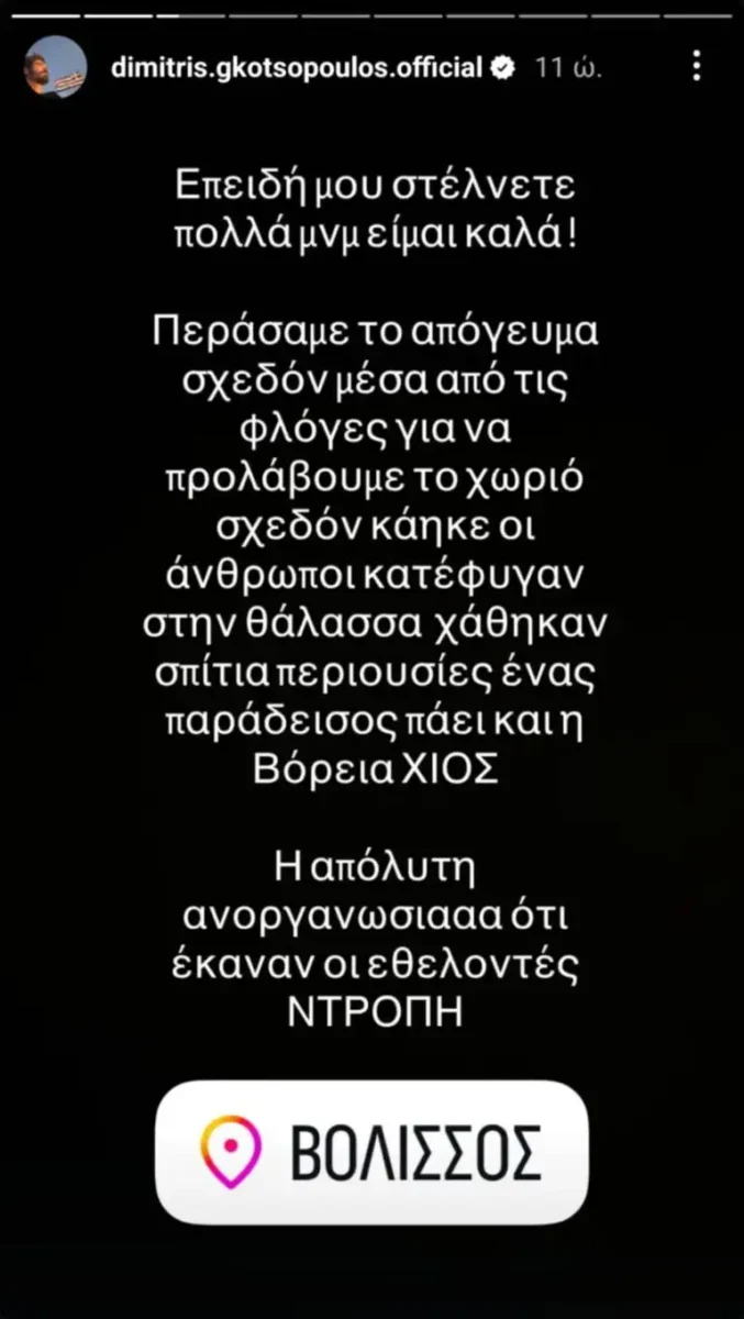 Στο νησί σε αυτές τις κρίσιμες ώρες βρίσκεται και ο ηθοποιός, Δημήτρης Γκοτσόπουλος, ο οποίος με μια ανάρτηση στα Instagram Stories του, περιέγραψε την εμπειρία του για τα όσα εκτυλίσσονται στην Χίο.
