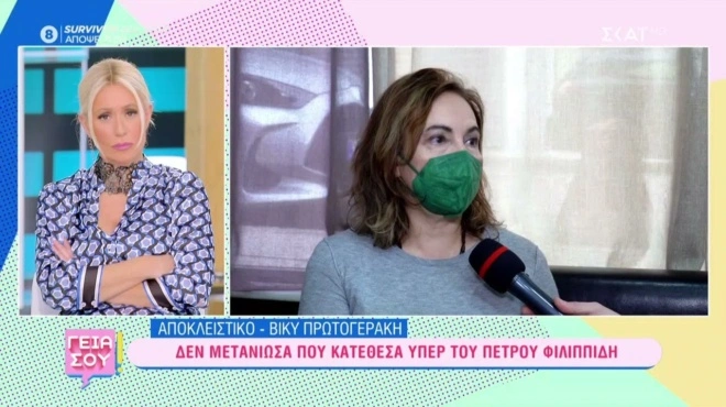 Η ηθοποιός Βίκυ Πρωτογεράκη μίλησε στην κάμερα του ΣΚΑΪ και στην εκπομπή “Γειά σου” και υποστήριξε για ακόμη μία φορά τον Πέτρο Φιλιππίδη.