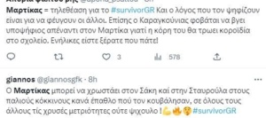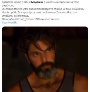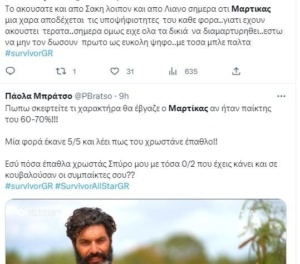 Το κοινό στο Twitter πάντως δηλώνει διχασμένο! Οι υποστηρικτές του Σπύρου Μαρτίκα κι όσοι έχουν βαρεθεί τα μαθήματα Survivor του professor, είναι πια μοιρασμένοι.