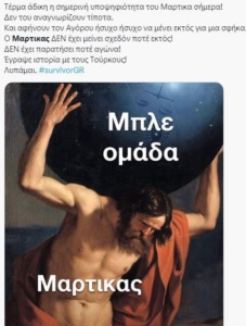 «Άγγιγμα Θεού η απάντησή μου. Εύχομαι να μην τελειώσει. Πω. Σεμινάριο. Διδάσκω Survivor να το ξέρεις. Πω πω κλάμα. Αχ τρελαίνομαι με τα cue», είχε πει ο Μαρτίκας στην προσωπική του συνέντευξη της προηγούμενης εβδομάδας, που πίστευε πως θα είναι η τελευταία του.