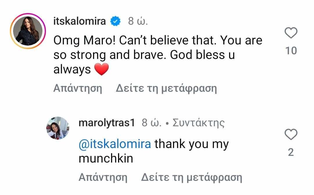 «Θεέ μου Μάρω! Δεν μπορώ να το πιστέψω. Είσαι τόσο δυνατή και γενναία. Ο Θεός να σε ευλογεί πάντα» έγραψε η Καλομοίρα στην Μάρω Λύτρα.