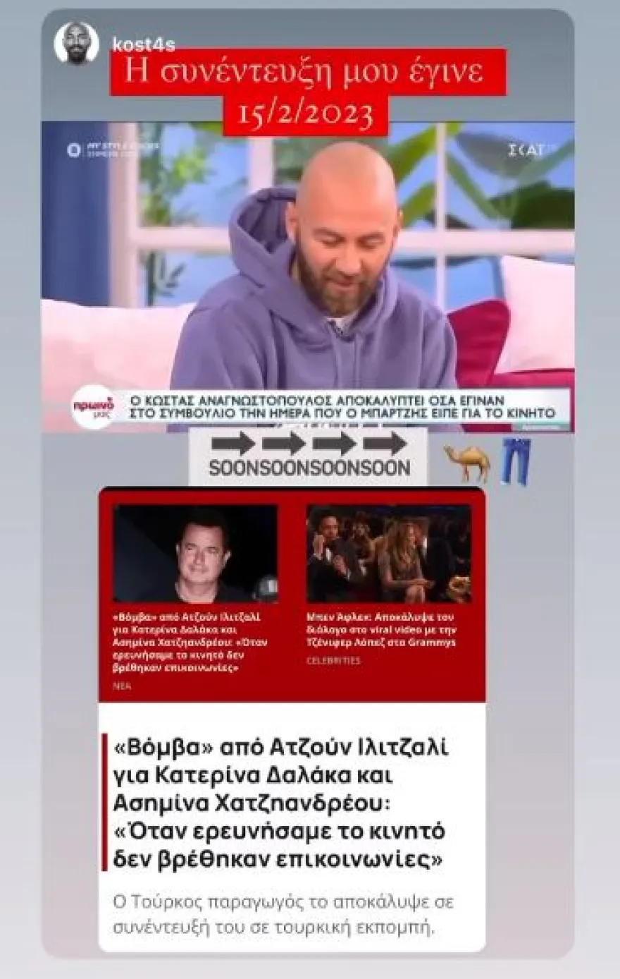 Σε επόμενο story, ανάρτησε ένα απόσπασμα από τη συνέντευξη του Κώστα Αναγνωστόπουλου από τις 15 Φεβρουαρίου στην εκπομπή «Πρωινό μας», όπου και υποστήριζε ότι ούτε η Κατερίνα Δαλάκα, αλλά ούτε και η Ασημίνα Χατζηανδρέου είχαν κάποια επικοινωνία εκτός παιχνιδιού.