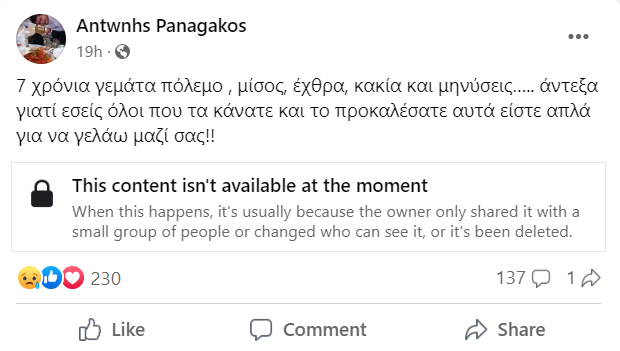 Σε μια από τις αναρτήσεις της στο Facebook η μητέρα του 43χρονου, Μαίρη Παναγάκου τονίζει μεταξύ άλλων: