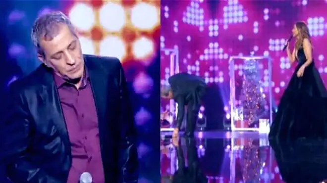 Χωρίς να χάσει στιγμή το κέφι του, έκανε μια… βουτιά που παρέπεμπε σε φιγούρα ζεϊμπέκικου κι άρπαξε το μικρόφωνο για να συνοδέψει ξανά τη Βανδή στο ρεφρέν του τραγουδιού.