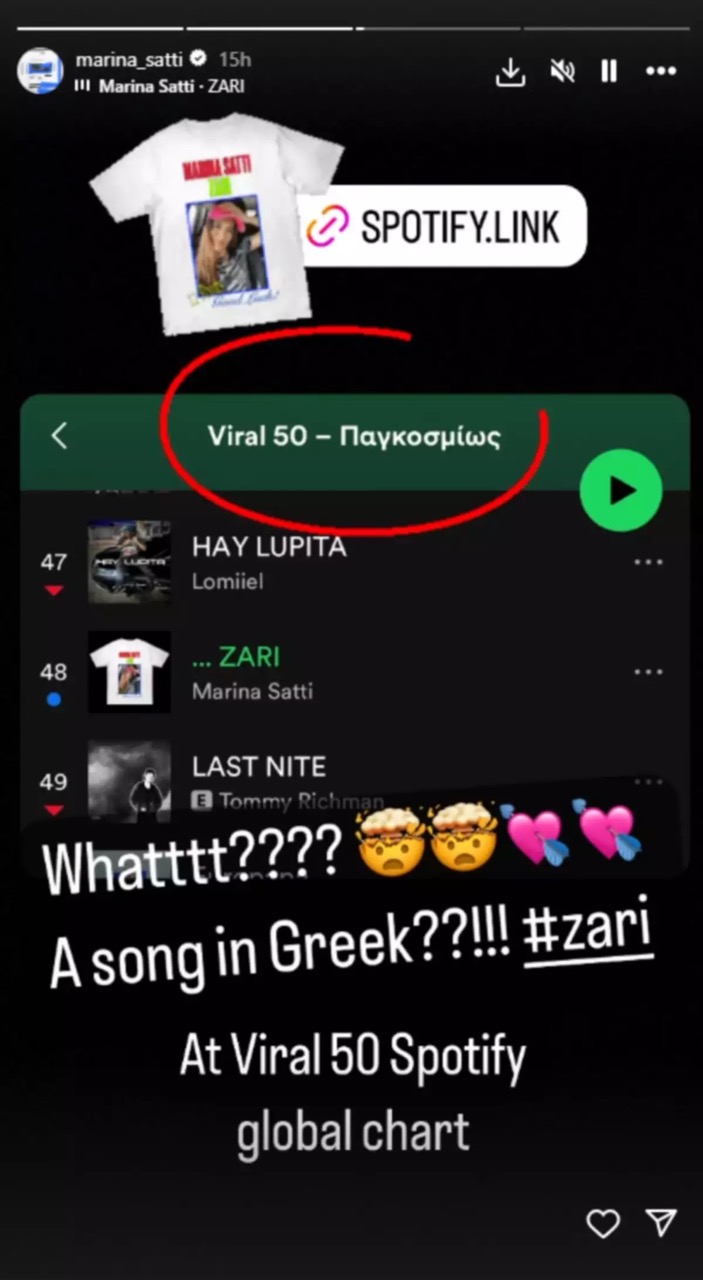 Το τραγούδι «Ζάρι» κατάφερε να μπει στη λίστα με τα 50 viral τραγούδια παγκοσμίως στο Spotify, κάτι που δεν έχει καταφέρει άλλο ελληνόφωνο κομμάτι μέχρι στιγμής. Η Μαρίνα Σάττι εξέφρασε την έκπληξή της μέσω Instagram, αναφέροντας: «Τι; Ένα τραγούδι στα ελληνικά; Στο παγκόσμιο τσαρτ του Viral 50 Spotify;». Οι ακόλουθοί της στο Instagram αυξήθηκαν από 90.000 τον περασμένο Δεκέμβριο στις 308.000 αυτή τη στιγμή.