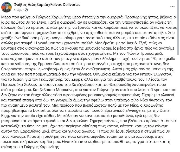 Ο Δεληβοριάς αναφέρθηκε σε σημαντικούς καλλιτέχνες για τους οποίους έγραψε ο Χαρωνίτης – από τον Zappa, τον Gainsbourg και τον Μορικόνε, μέχρι τον Πλέσσα, τον Χαλκιά και τον Σαββόπουλο – τονίζοντας πως τα κείμενά του εξακολουθούν να εμπνέουν και να καθοδηγούν. Η φιλία τους, όπως περιγράφει, είχε γλυκύτητα και διάρκεια, ενώ έκλεισε την ανάρτησή του με την αίσθηση πως «ίσως κάπως, κάπου, κάποτε τον μαραθώνιο των Avengers τον κάναμε ήδη μαζί. Ή πως θα τον κάνουμε».
