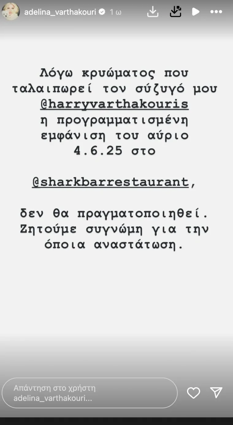 Συγκεκριμένα, η Αντελίνα Βαρθακούρη έγραψε: «Λόγω κρυώματος που ταλαιπωρεί τον σύζυγό μου, Χάρη Βαρθακούρη, η προγραμματισμένη εμφάνισή του αύριο 4/6 δεν θα πραγματοποιηθεί. Ζητούμε συγνώμη για την αναστάτωση».
