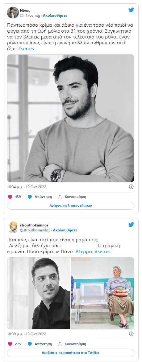 #serres ποσο κρίμα γι αυτό το παιδί.. κανονικά έπρεπε να τη βάλουν ολόκληρη τη σειρά στο κανάλι προς τιμήν του Πάνου. Ένας άνθρωπος που έχασε τη ζωή του κι αυτή ήταν η τελευταία του σειρά.
