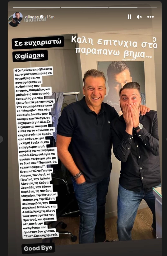 Ευχαριστώ το Γιωργο Λιαγκα, τον ΑΝΤ1, το Πρω1νό, την Αγλαία Λάτσιου, τη Χρύσα Ζορκάδη, την Τέσσα Κορλέτη, τη Νατάσα Μαχαίρα, την Κατερίνα Παπαμερή, την Ελένη Βουλγαρίδου, την Αγγελική Μπιλίνη, την Αλεξία Κράχτη, όλους τους συνεργάτες του Πρω1νού, και φυσικά όλη αυτή την οικογένεια που ήμασταν δυο χρονια, “Ένα”. Σας ευχαριστώ» έγραψε στην ανάρτησή του και δημοσίευσε μία φωτογραφία, στην οποία ποζάρει μαζί με τον Γιώργο Λιάγκα.