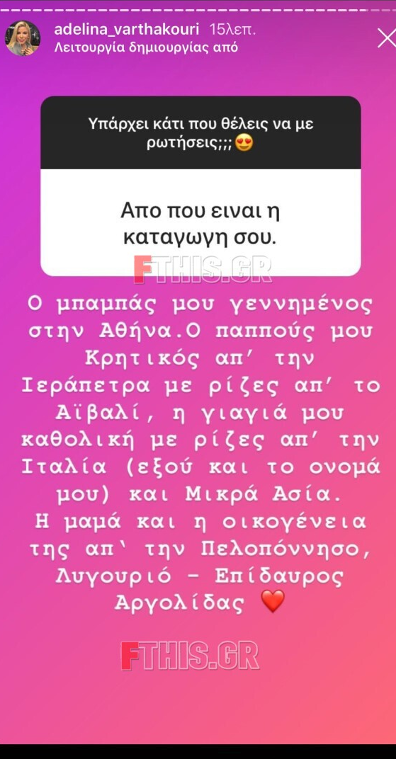 Έτσι, λοιπόν, πρόσφατα η Αντελίνα Βαρθακούρη έκανε ένα Q&A και απάντησε στις ερωτήσεις των διαδικτυακών της ακόλουθων.