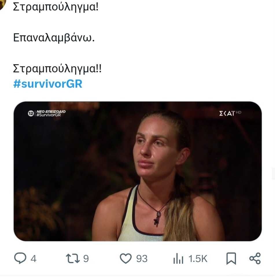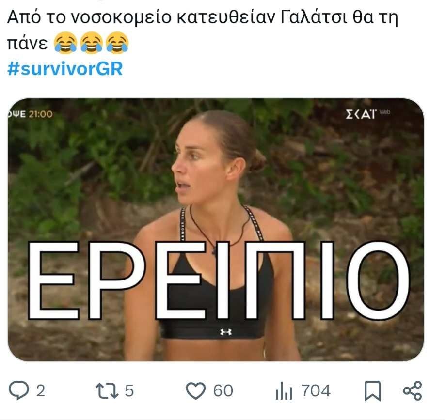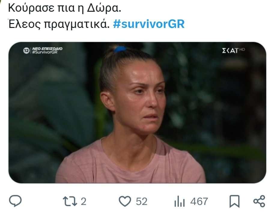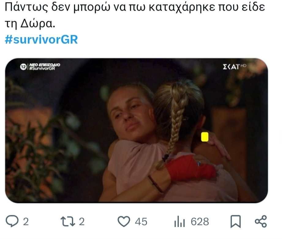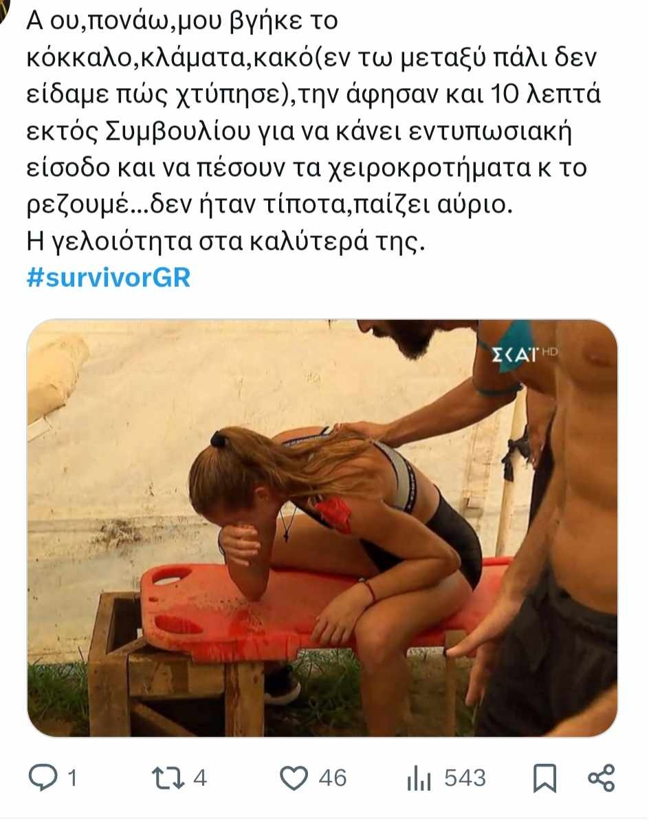 Παρά ταύτα, οι γιατροί του Survivor της παρείχαν τις πρώτες βοήθειες, με την Κατερίνα Δαλάκα να εκφράζει τη λύπη της για την “ατυχία” της, αναφέροντας ότι της συνέβη και αυτό πέρα από τον τραυματισμό στον ώμο.