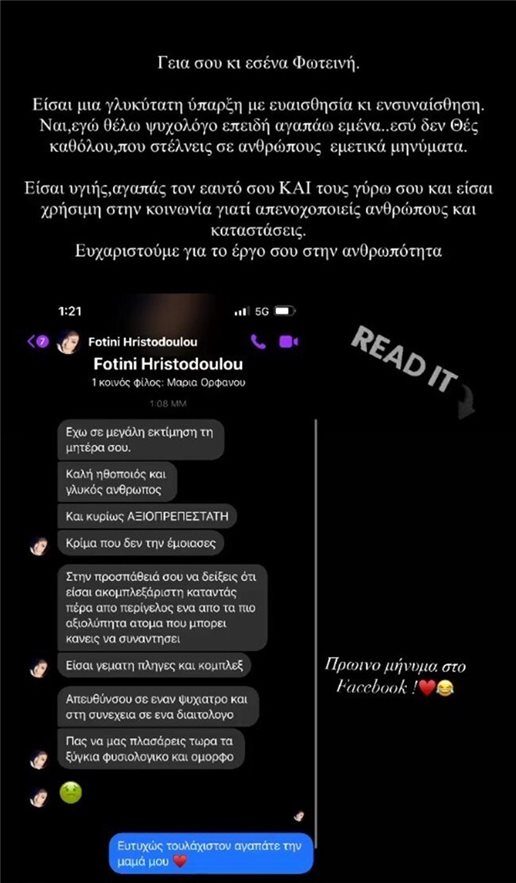 Η δημοφιλής παρουσιάστρια της απάντησε δημόσια μέσα από τα instastory της σημειώνοντας: «Γεια σου και σένα Φωτεινή. Είσαι μία γλυκύτατη ύπαρξη με ευαισθησία και ενσυναίσθηση. Ναι, εγώ θέλω ψυχολόγο επειδή αγαπώ εμένα… εσύ δεν θες καθόλου, που στέλνεις σε ανθρώπους εμετικά μηνύματα. Είσαι υγιής, αγαπάς τον εαυτό σου ΚΑΙ τους γύρω σου και είσαι χρήσιμη στην κοινωνία γιατί απενοχοποιείς ανθρώπους και καταστάσεις. Ευχαριστούμε για το έργο σου στην ανθρωπότητα».