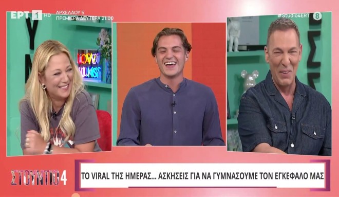 Η Νάνσυ Ζαμπέτογλου σήκωσε κατά λάθος το μεσαίο δάχτυλο, ενώ έκανε ασκήσεις με τα δάχτυλα, για να γυμναστεί ο εγκέφαλος, μαζί με τον Θανάση Αναγνωστόπουλο, στο Στούντιο 4, χθες, Τετάρτη.