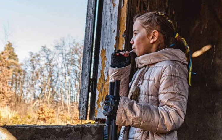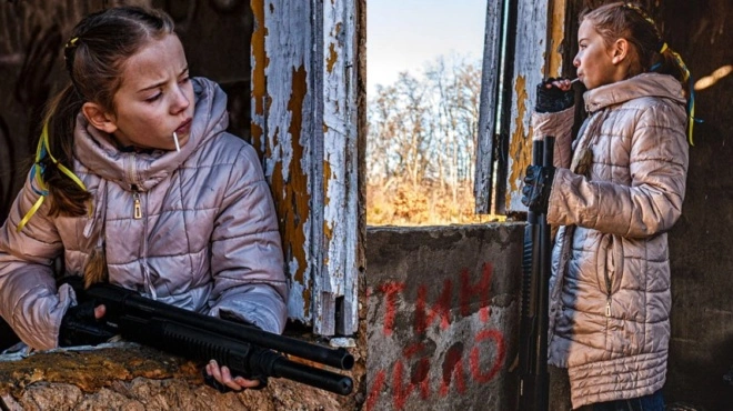 Τον γύρο του διαδικτύου κάνει τις τελευταίες μέρες μία φωτογραφία, η οποία δείχνει ένα κορίτσι μόλις 9 ετών, με κοτσιδάκι με τα χρώματα της Ουκρανίας που έχει στο στόμα ένα γλειφιτζούρι και κρατά ένα αυτόματο όπλο.
