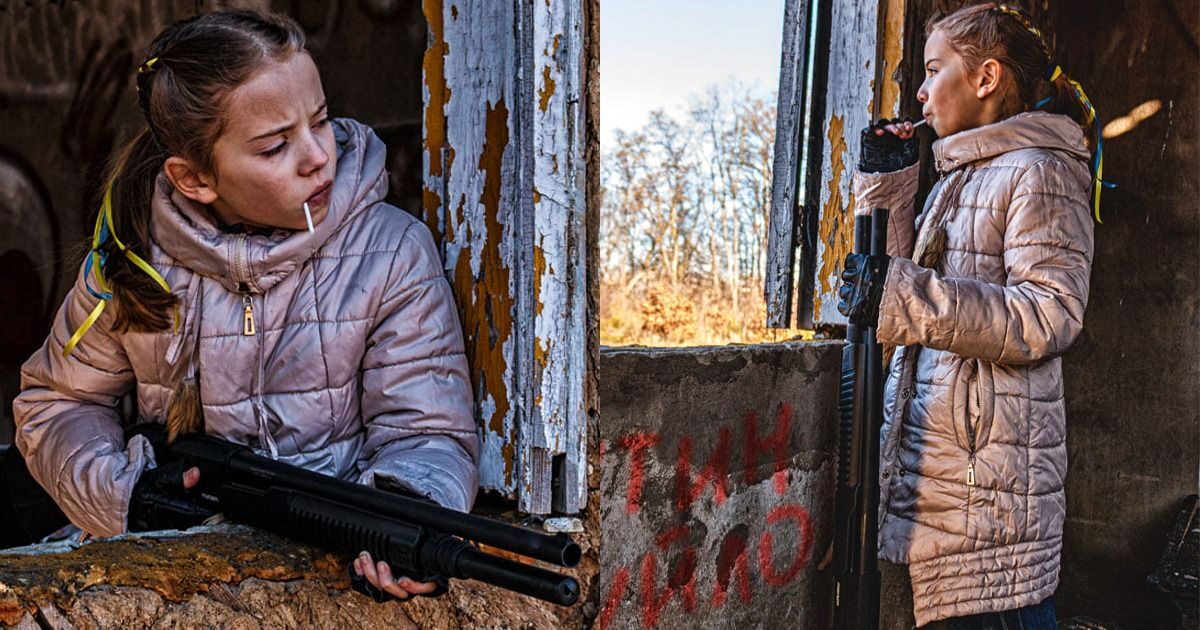 Τον γύρο του διαδικτύου κάνει τις τελευταίες μέρες μία φωτογραφία, η οποία δείχνει ένα κορίτσι μόλις 9 ετών, με κοτσιδάκι με τα χρώματα της Ουκρανίας που έχει στο στόμα ένα γλειφιτζούρι και κρατά ένα αυτόματο όπλο.