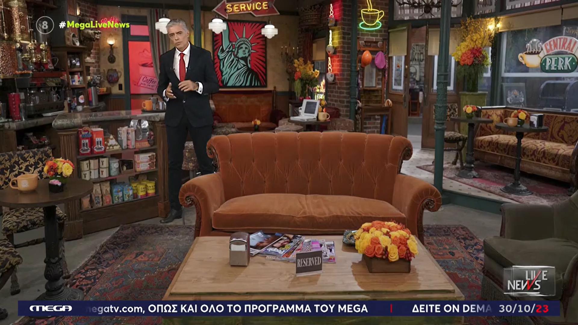 Όμως ο παρουσιαστής του Mega το πήγε ένα βήμα παρακάτω και εμφανίστηκε, στο πρώτο από τα πολλά ρεπορτάζ για τον θάνατο του αγαπημένου ηθοποιού, μέσα από την καφετέρια Central Perk της Νέας Υόρκης. Το αγαπημένο στέκι δηλαδή των Friends, στο οποίο επί δέκα χρόνια συναντιόντουσαν για να πιουν καφέ και να συζητήσουν.