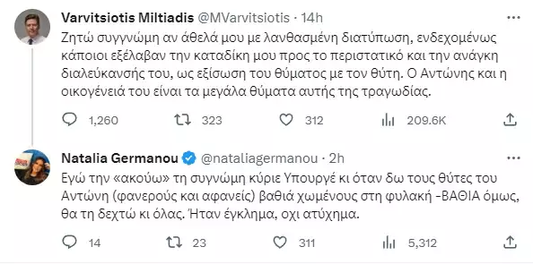 «Εγώ την «ακούω» τη συγνώμη κύριε Υπουργέ κι όταν δω τους θύτες του Αντώνη (φανερούς και αφανείς) βαθιά χωμένους στη φυλακή -ΒΑΘΙΑ όμως, θα τη δεχτώ κιόλας. Ήταν έγκλημα, όχι ατύχημα», ήταν το σχόλιο που έκανε η Ναταλία Γερμανού κάτω από την ανάρτηση του Μιλτιάδη Βαρβιτσιώτη.