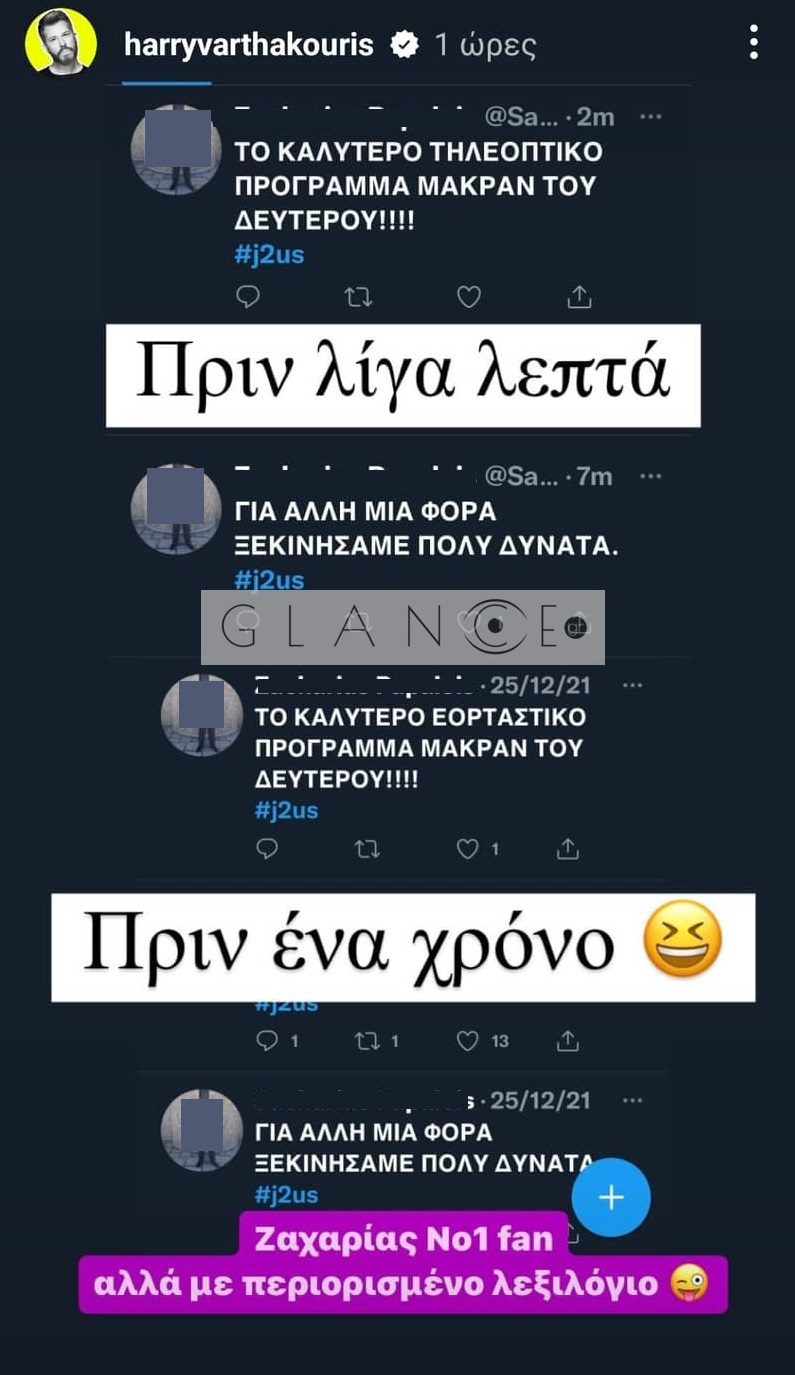 «Ζαχαρίας Νο1 fan αλλά με περιορισμένο λεξιλόγιο», σχολίασε ακόμα με χιούμορ ο Χάρης Βαρθακούρης.