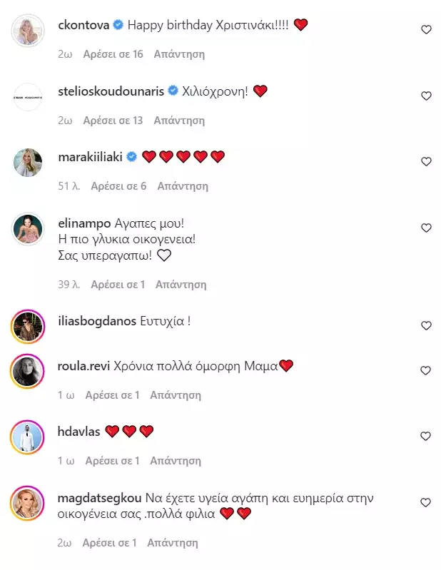 Οι αγαπημένοι της φίλοι της ευχήθηκαν με ξεχωριστή ανάρτηση στο Instagram αλλά και κάτω από τη φωτογραφία όπου έσβηνε την τούρτα της με τις κόρες της.