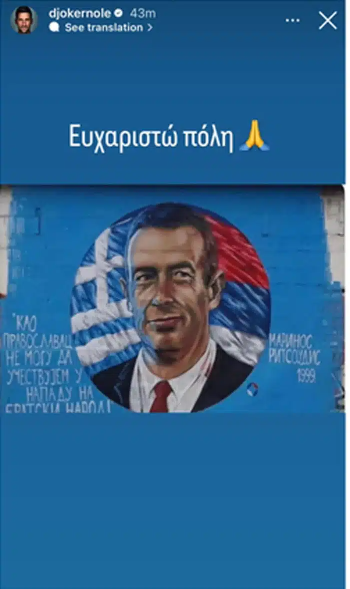 Ο Τζόκοβιτς θυμήθηκε δημοσίευσε μια τοιχογραφία από το Droćol, που απεικονίζει τον Έλληνα Ανθυποπλοίαρχο Μαρίνο Ριτσούδη, ο οποίος αρνήθηκε να βομβαρδίσει τη Σερβία το 1999. Μάλιστα, έγραψε στα ελληνικά με ένα μικρό… ορθογραφικό λάθος «Ευχαριστώ πόλη».