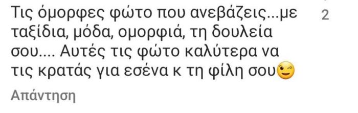 Και μπορεί 1700 περίπου άτομα να απάντησαν στο poll που είχε βάλει κάτω από τις φωτογραφίες της, βγάζοντας «νικητή» το μελομακάρονο, όμως αρκετοί στα σχόλιά τους τόνισαν πως η φωτογραφία που η φίλη της κάνει μια άσεμνη χειρονομία με το χέρι της – και μάλιστα βρίσκεται πρώτη πρώτη στη συγκεκριμένη ανάρτηση – δεν αρμόζει στην ίδια ούτε και στο περιεχόμενο που θέλουν να βλέπουν στο Instagram.