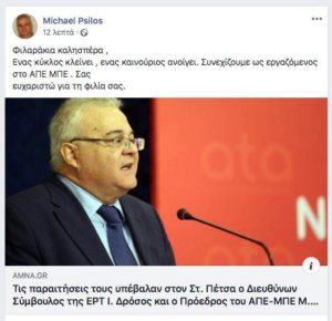 «Φιλαράκια καλησπέρα, ένας κύκλος κλείνει, ένας καινούργιος ανοίγει. Συνεχίζουμε, ως εργαζόμενος στο ΑΠΕ ΜΠΕ. Σας ευχαριστώ για τη φιλία σας» και από κάτω παρέθετε τη σχετική είδηση με τη φωτογραφία του.