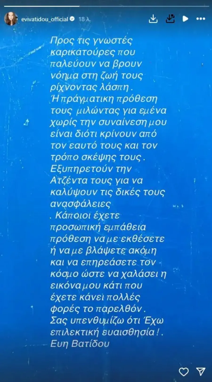 «Προς τις γνωστές καρικατούρες που παλεύουν να βρουν νόημα στη ζωή τους ρίχνοντας λάσπη. Η πραγματική πρόθεσή τους, μιλώντας για εμένα χωρίς τη συναίνεσή μου, είναι διότι κρίνουν από τον εαυτό τους ή τον τρόπο σκέψης τους. Εξυπηρετούν την ατζέντα τους για να καλύψουν τις δικές τους ανασφάλειες. Κάποιοι έχετε προσωπική εμπάθεια, πρόθεση να με εκθέσετε ή να με βλάψετε ακόμη και να επηρεάσετε τον κόσμο, ώστε να χαλάσει η εικόνα μου, κάτι που έχετε κάνει πολλές φορές στο παρελθόν. Σας υπενθυμίζω ότι έχω επιλεκτική ευαισθησία!».