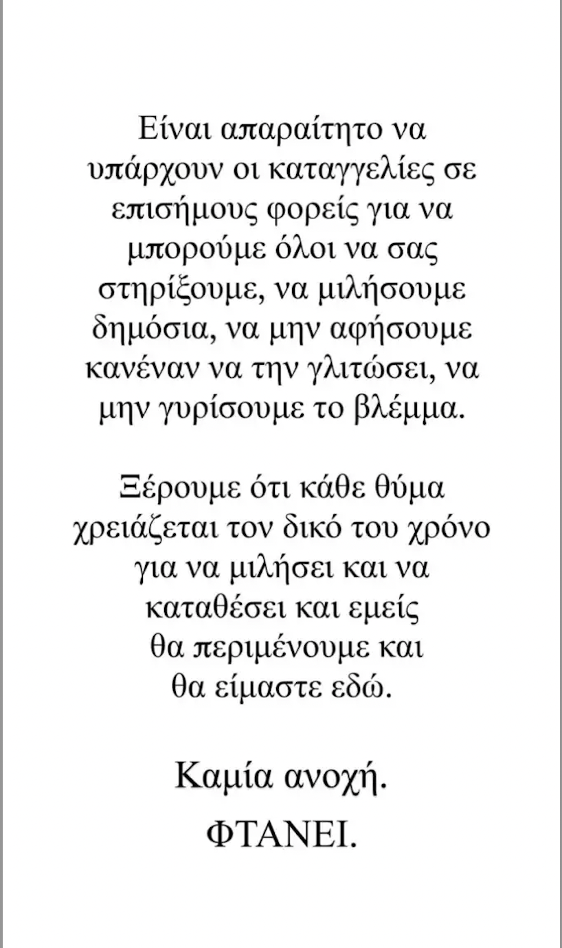 Είναι απαραίτητο να υπάρχουν οι καταγγελίες σε επίσημους φορείς για να μπορούμε όλοι να σας στηρίξουμε, να μιλήσουμε δημόσια, να μην αφήσουμε κανέναν να την γλιτώσει να μην γυρίσουμε το βλέμμα. Ξέρουμε ότι κάθε θύμα χρειάζεται τον δικό του χρόνο για να μιλήσει και να καταθέσει και εμείς θα περιμένουμε και θα είμαστε εδώ. Καμία ανοχή. ΦΤΑΝΕΙ».