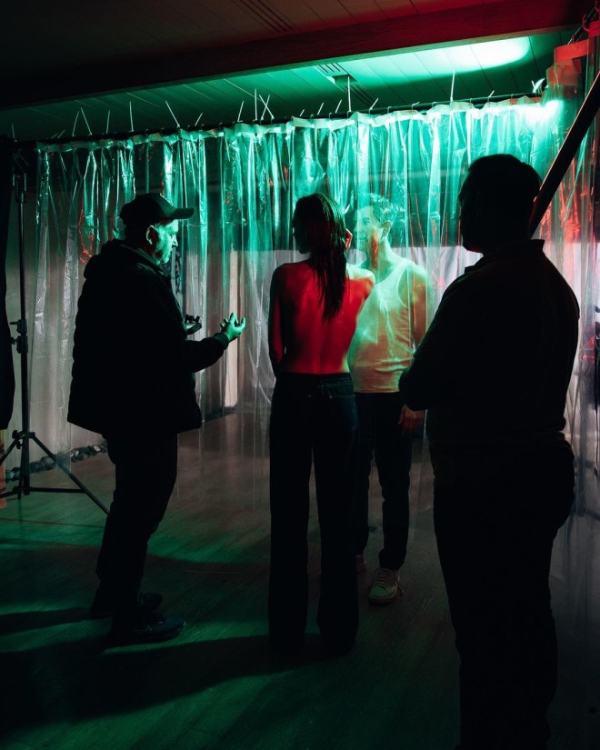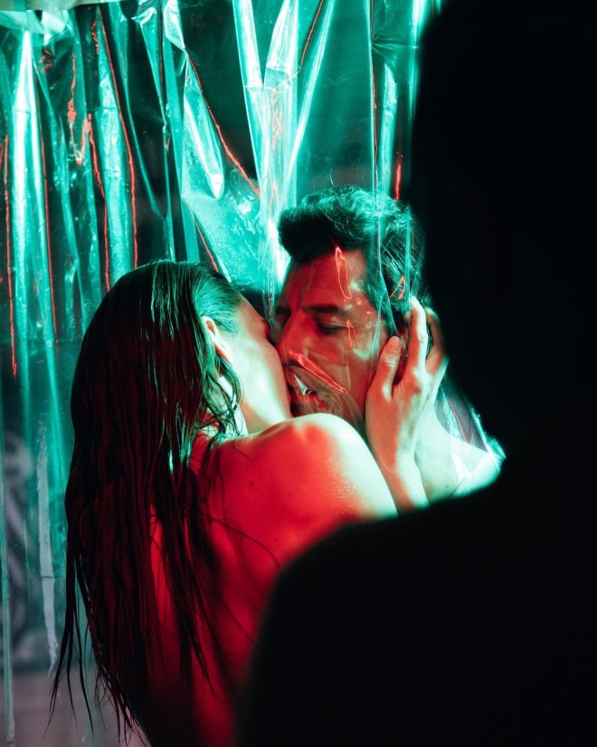 Σε μία από αυτές εμφανίζεται ο ίδιος να φιλάει στο στόμα μία ημίγυμνη γυναίκα, ενώ τους χωρίζει μία διάφανη κουρτίνα που υπάρχει ανάμεσά τους. Σε άλλο στιγμιότυπο με το μοντέλο, οι δυο τους στέκονται και ακούν τις οδηγίες, πιθανότατα του σκηνοθέτη.