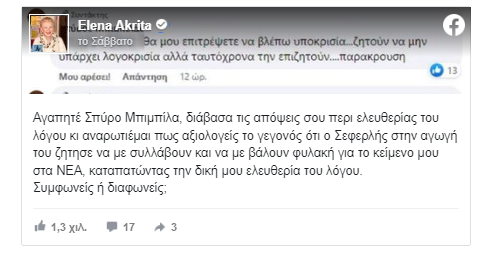 Αυτό προκάλεσε την αντίδραση της Έλενας Ακρίτα. Η δημοσιογράφος και συγγραφέας δημοσίευσε στο λογαριασμό της το σχετικό σχόλιο του Σπύρου Μπιμπίλα και έκανε αναφορά στη δική της υπόθεση με τον Μάρκο Σεφερλή.