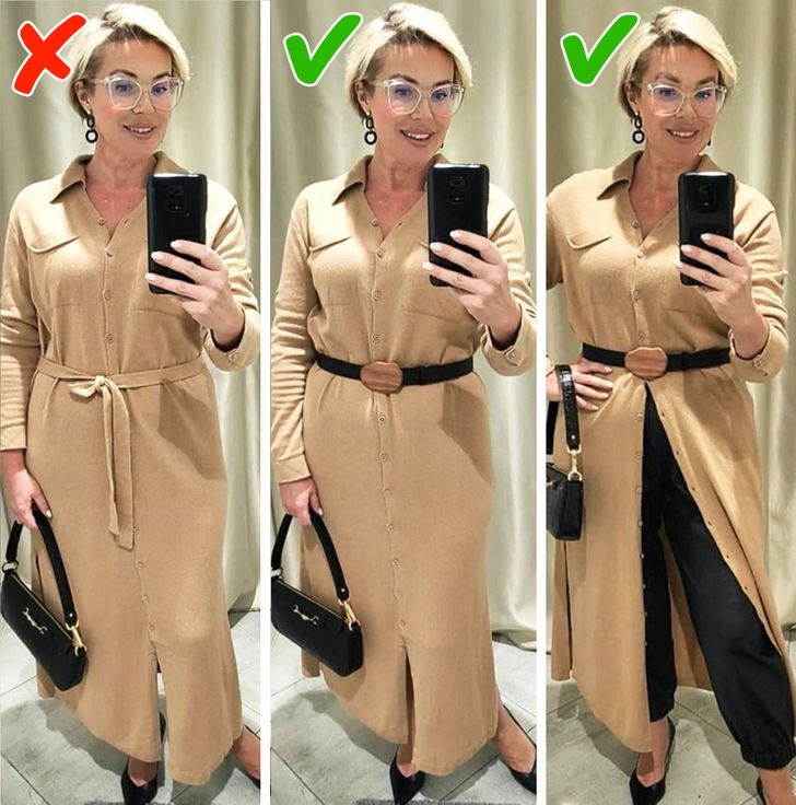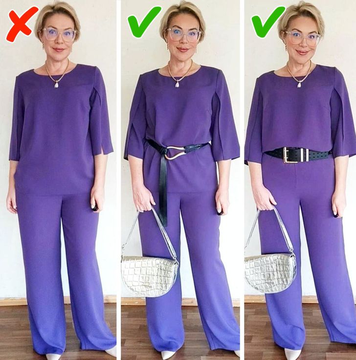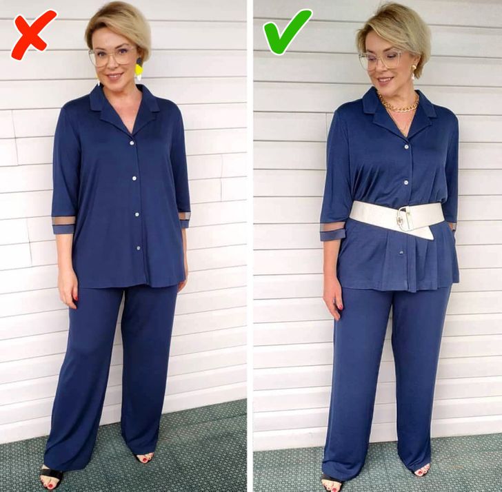 - Διορθωμένες αναλογίες. Μπορείτε είτε να τονίσετε τη μέση με τη βοήθεια μιας ζώνης και να κρατήσετε το πουκάμισο κουμπωμένο. Ή μπορείτε να ξεκουμπώσετε το πουκάμισο δημιουργώντας έτσι μια κάθετη γραμμή στην εμφάνισή σας, αν δεν σας αρέσουν οι ζώνες και δεν θέλετε να τονίσετε τη μέση σας. Αυτό το κόλπο θα σας βοηθήσει να φανείτε πιο αδύνατες. Σε αυτήν την περίπτωση, είναι προτιμότερο να επιλέξετε ένα πουκάμισο που ταιριάζει με το χρώμα του παντελονιού.