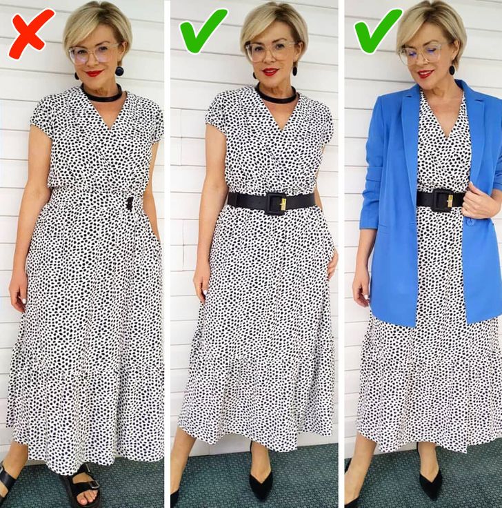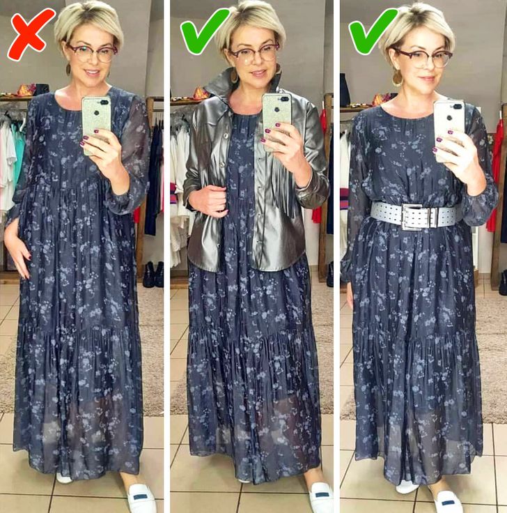 - Εδώ είναι ένα άλλο παράδειγμα με ένα φόρεμα: το σακάκι με βοήθησε να δημιουργήσω μια κάθετη γραμμή και η ζώνη βοήθησε στο να βελτιώσω το σχήμα του σώματός μου.