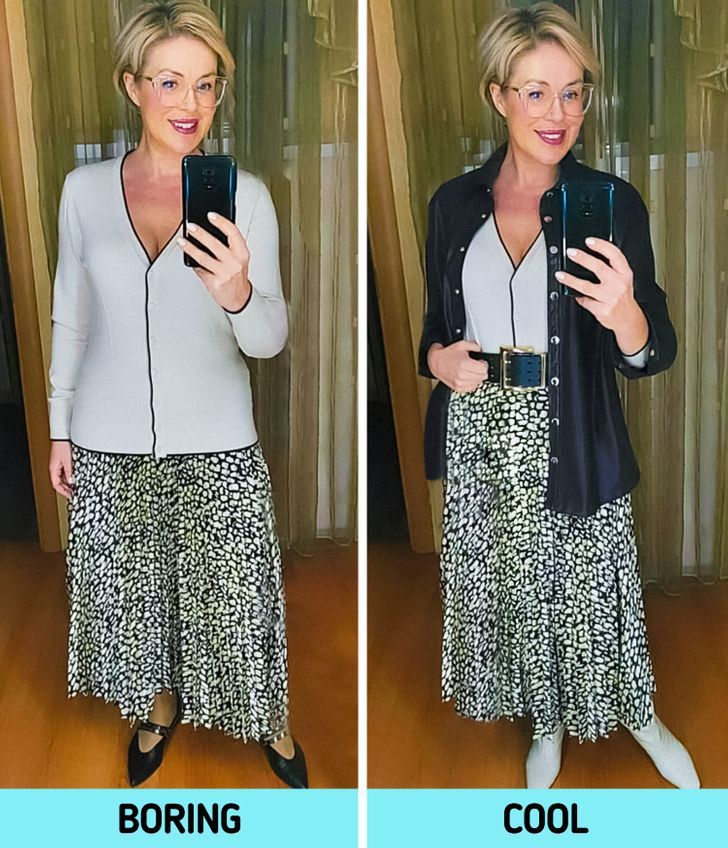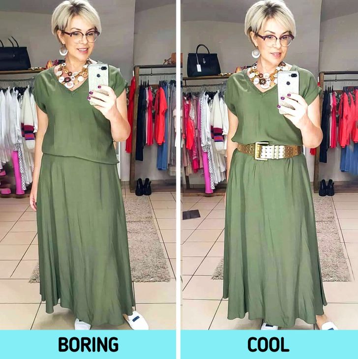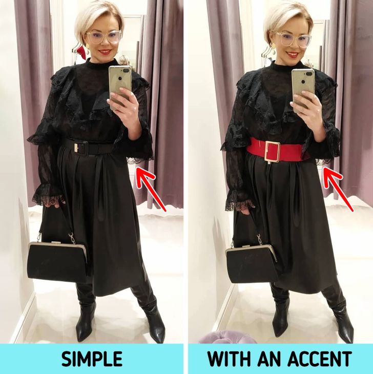 Οι μικρές λεπτομέρειες στην εμφάνισή μας παίζουν πραγματικά σπουδαίο ρόλο στο τελικό αποτέλεσμα. Αν και κανένα από τα ρούχα μου δεν είναι ξεπερασμένο, η φωτογραφία στα αριστερά θα έκανε κάθε κορίτσι να μοιάζει με τετράγωνο. Δεν άλλαξα ούτε ένα ρούχο, αλλά έδωσα έμφαση για να κάνω αυτά τα λουκ να φαίνονται διαφορετικά. Το μόνο που έκανα ήταν: