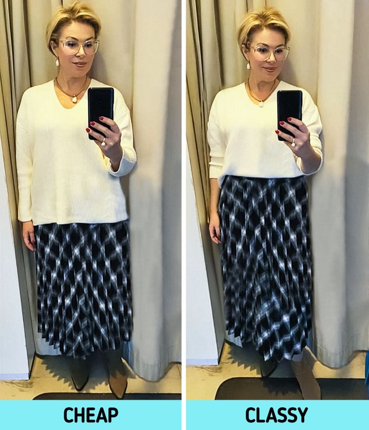 - Αντικατέστησα τη φούστα. Το κομμάτι που χρησιμοποίησα στην εμφάνιση στην αριστερή φωτογραφία δεν είναι πλέον στην μόδα. Το μήκος της φούστας δεν είναι καλό – ιδανικά, πρέπει να είναι είτε πάνω από το γόνατο, είτε όπως στην περίπτωσή μου, κάτω από το γόνατο. Θα ήταν καλό η φούστα να έχει ασύμμετρο τελείωμα – θα αφαιρέσει έτσι μια κάθετη γραμμή.